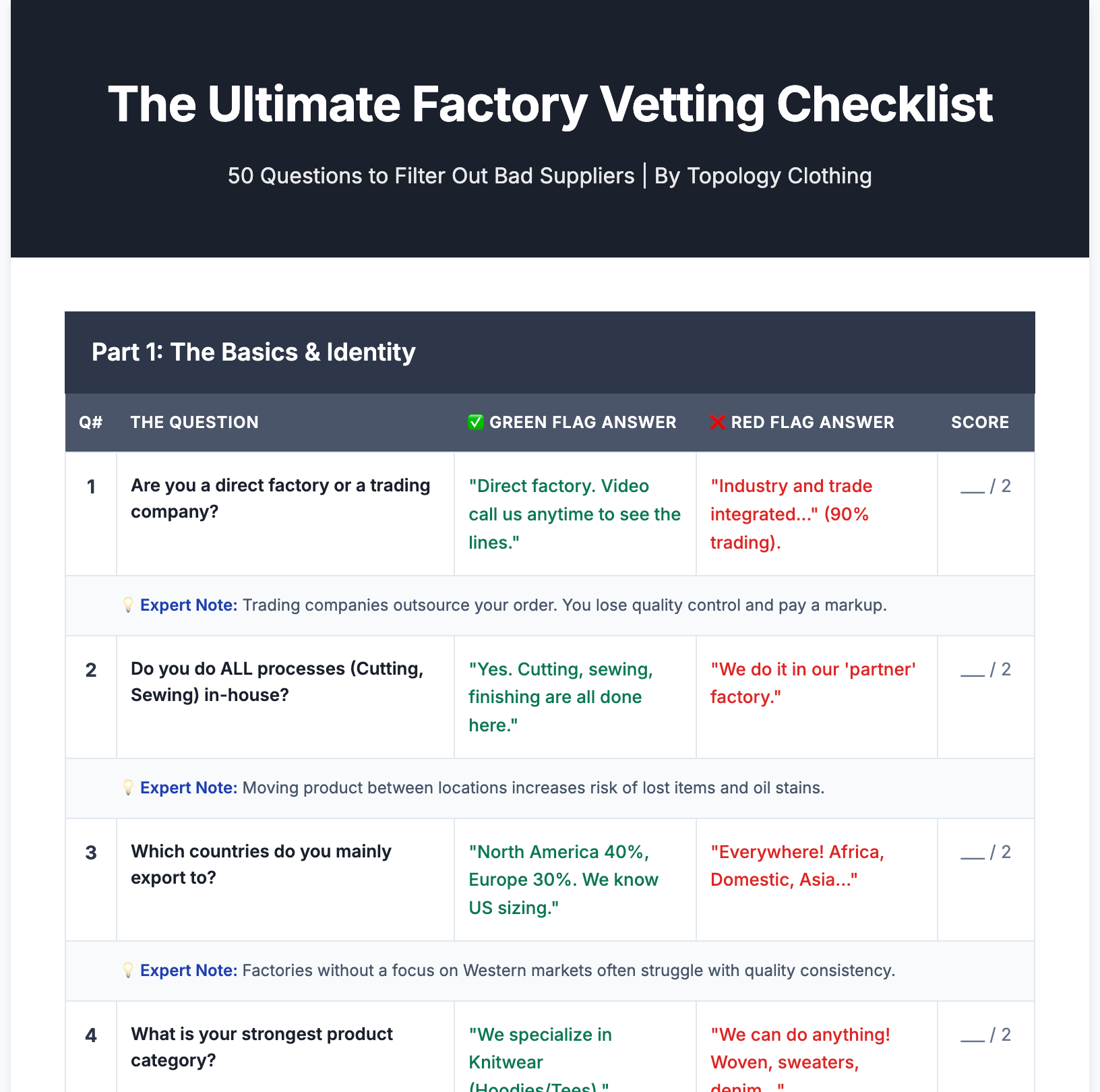 Red Flag vs. Green Flag Answers: Don't just ask the question—know exactly what answer you need to hear. Instantly spot when a factory is lying to you.